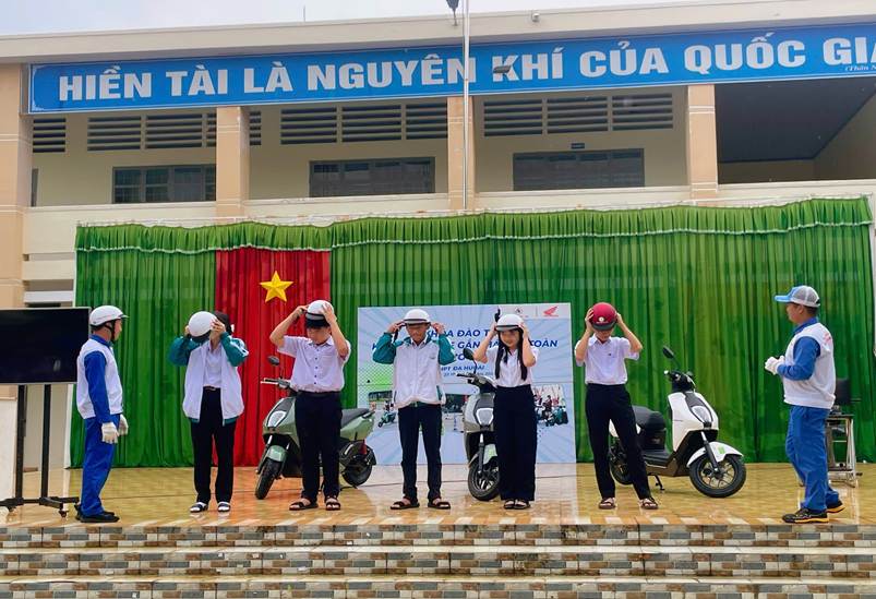 Học sinh thực hành đội mũ bảo hiểm đúng cách