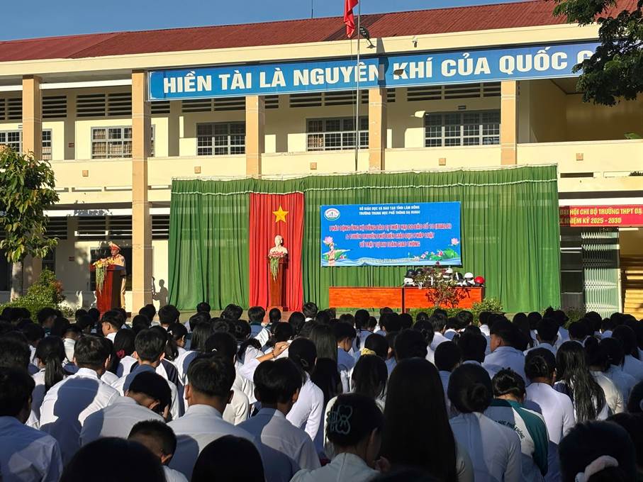 Sáng ngày 20/10/2025 trường THPT Đạ Huoai đã tổ chức thành công Chương trình mang tên “Tháng Nhân Ái và An Toàn”, với ba hoạt động chính đan xen, nhằm lan tỏa tinh thần sẻ chia, nâng cao ý thức chấp hành pháp luật và tôn vinh phái đẹp. Tham dự chương trình có thầy Chu Quý Hợi – Bí thư chi bộ - Hiệu trưởng nhà trường; đồng chí Thái Doãn Hợp – Phó trưởng trạm Cảnh sát giao thông MaDaGuoi, đồng chí Đào Trọng Nghĩa – Cán bộ trạm Cảnh sát giao thông MaDaGuoi, xã Đạ huoai; đồng chí Lưu Thế Duy - Tổ trưởng tổ phòng chống tội phạm – Công an xã Đạ Huoai, đồng chí Nguyễn Đình Công – Cán bộ đội Cảnh sát trật tự - Công an xã Đạ Hoai, cùng sự có mặt đầy đủ của quý thầy cô giáo và hơn 600 em học sinh.
