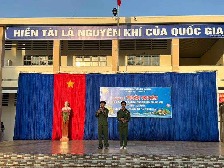 Trong không khí hân hoan, phấn khởi của toàn Đảng, toàn dân và toàn quân cả nước hướng về kỷ niệm 81 năm Ngày thành lập Quân đội nhân dân Việt Nam (22/12/1944 – 22/12/2025) dấu mốc vẻ vang của Quân đội nhân dân Việt Nam, sáng ngày 22/12/2025, Trường THPT Đạ Huoai đã tổ chức buổi sinh hoạt chuyên đề ý nghĩa nhằm ôn lại truyền thống vẻ vang của Quân đội nhân dân Việt Nam. Chương trình được triển khai với sự phối hợp chặt chẽ giữa Đoàn Trường và Tổ chuyên môn Lịch sử – Địa lý – Giáo dục kinh tế và Pháp luật, góp phần nâng cao hiệu quả công tác giáo dục truyền thống, bồi đắp niềm tự hào dân tộc và lý tưởng cách mạng cho học sinh trong toàn trường.