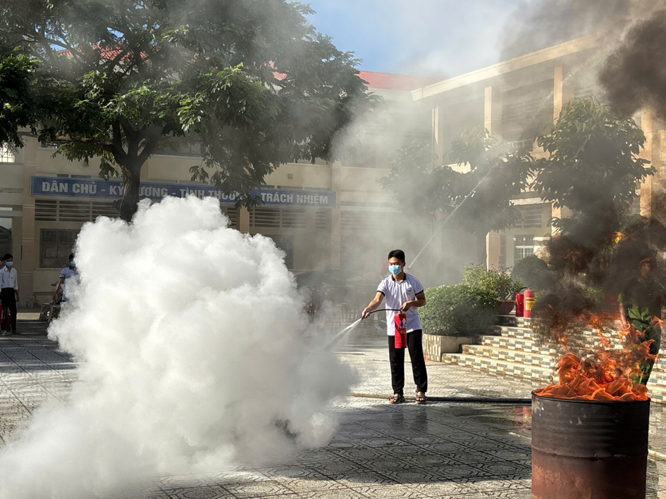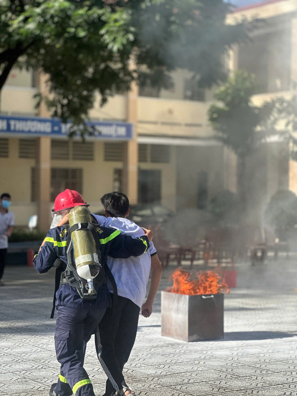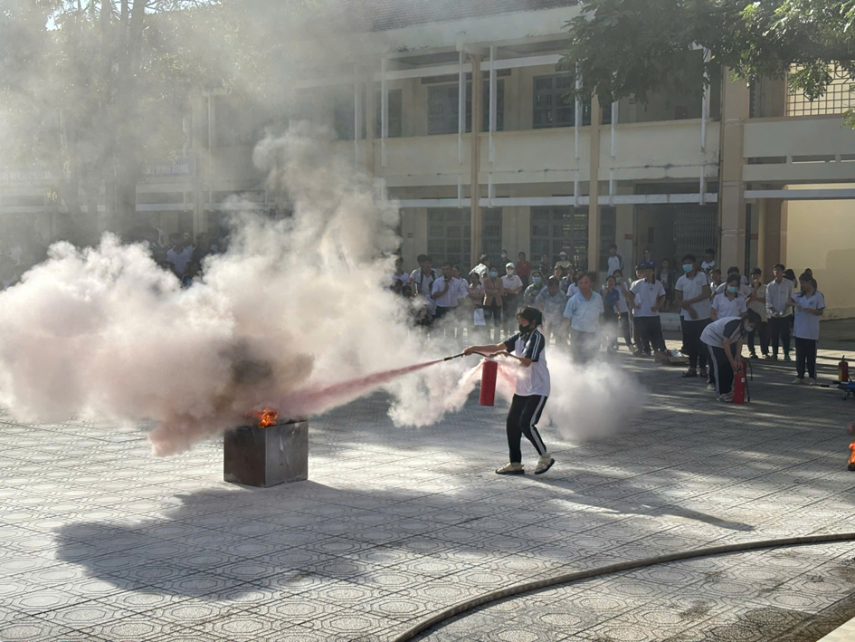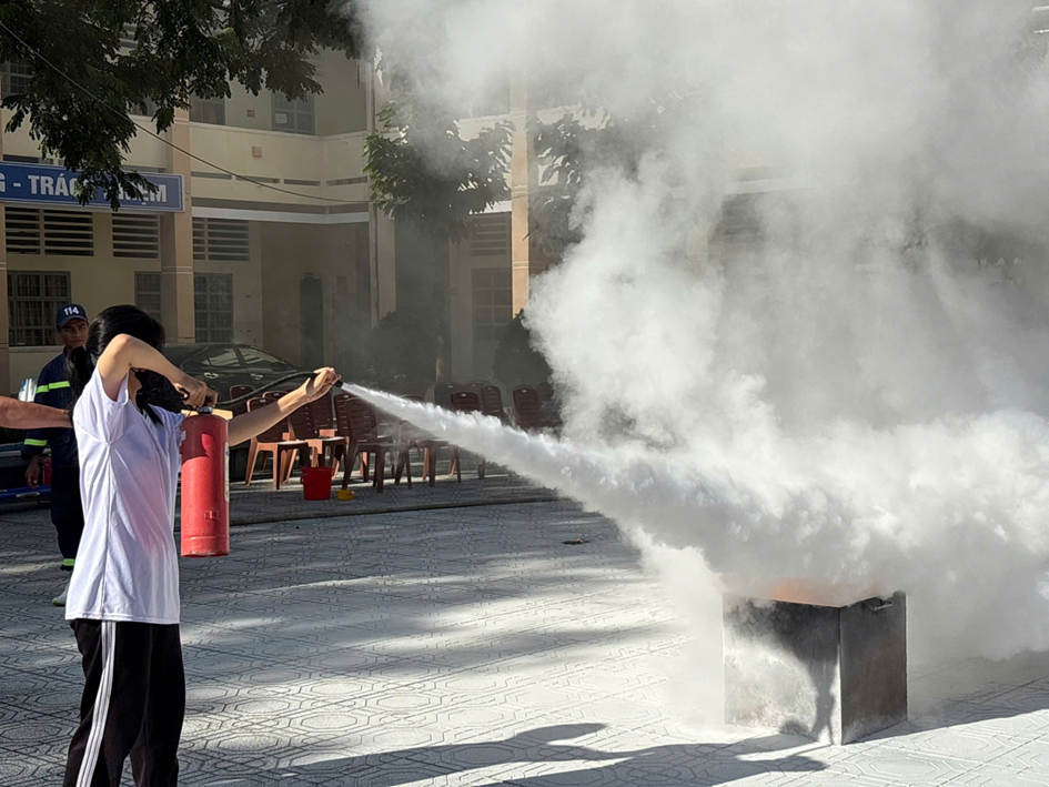 Sau phần lý thuyết, toàn thể cán bộ, giáo viên, nhân viên và học sinh đã tham gia thực hành chữa cháy và diễn tập các tình huống giả định theo phương án phòng cháy, chữa cháy và cứu nạn cứu hộ của nhà trường. Dưới sự hướng dẫn trực tiếp của lực lượng PCCC&CNCH của Đội Cảnh sát PCCC& CNCH khu vực 4, các thầy cô giáo và học sinh được thực hành thao tác sử dụng bình khí CO₂, bình bột để dập tắt đám cháy, đồng thời tham gia nội dung diễn tập chữa cháy – cứu nạn, cứu hộ theo quy trình chuẩn.