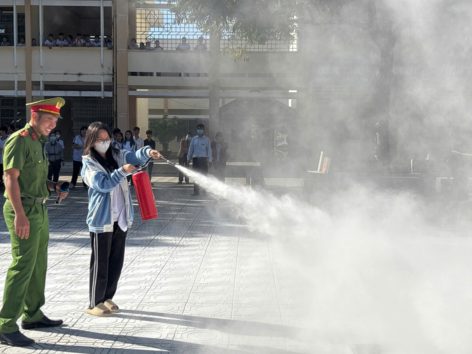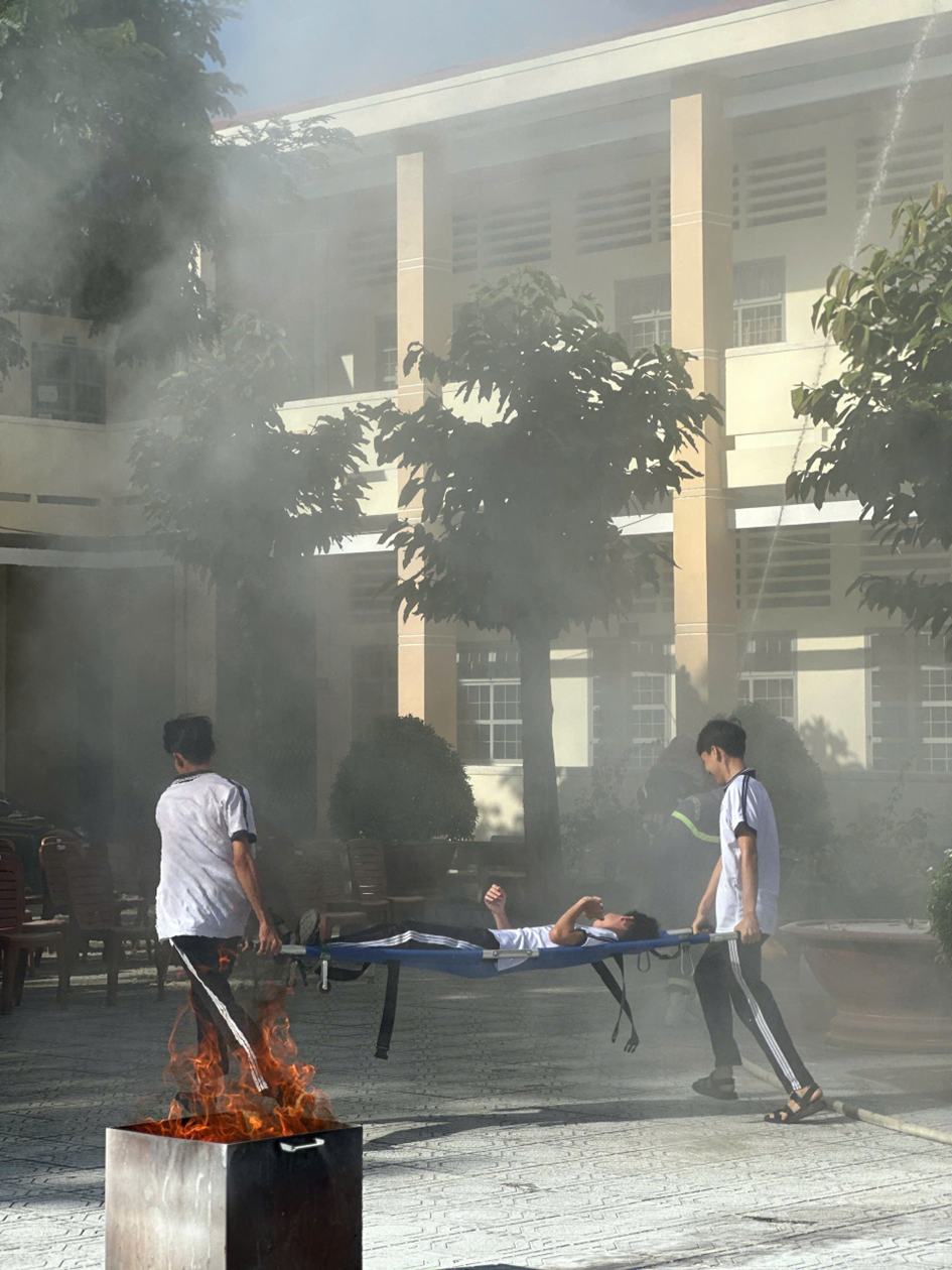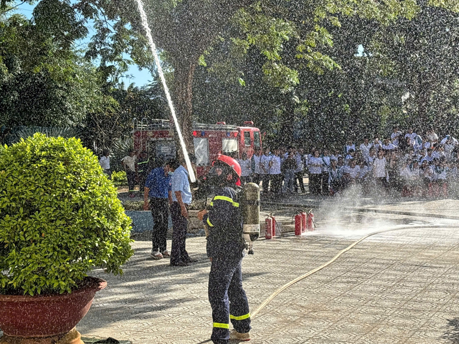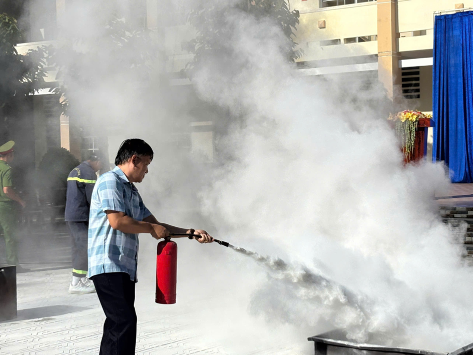 Sau phần lý thuyết, toàn thể cán bộ, giáo viên, nhân viên và học sinh đã tham gia thực hành chữa cháy và diễn tập các tình huống giả định theo phương án phòng cháy, chữa cháy và cứu nạn cứu hộ của nhà trường. Dưới sự hướng dẫn trực tiếp của lực lượng PCCC&CNCH của Đội Cảnh sát PCCC& CNCH khu vực 4, các thầy cô giáo và học sinh được thực hành thao tác sử dụng bình khí CO₂, bình bột để dập tắt đám cháy, đồng thời tham gia nội dung diễn tập chữa cháy – cứu nạn, cứu hộ theo quy trình chuẩn.