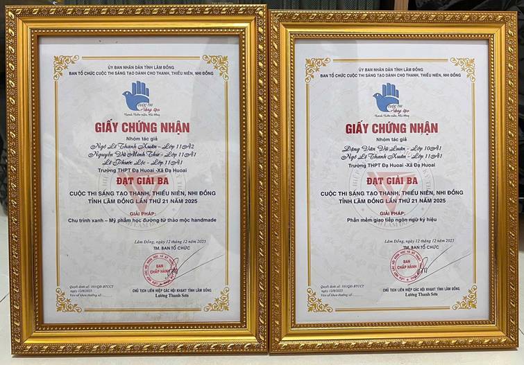 Trong không khí trang trọng của Hội nghị tổng kết và trao giải Cuộc thi Sáng tạo Thanh thiếu niên, Nhi đồng tỉnh Lâm Đồng lần thứ XXI năm 2025, Trường THPT Đạ Huoai vinh dự ghi dấu ấn với 02 sản phẩm dự thi xuất sắc, mang về 02 Giải Ba cấp tỉnh. Thành tích này không chỉ khẳng định năng lực sáng tạo của học sinh nhà trường mà còn thể hiện rõ định hướng giáo dục toàn diện, chú trọng nghiên cứu khoa học và đổi mới sáng tạo trong nhà trường.