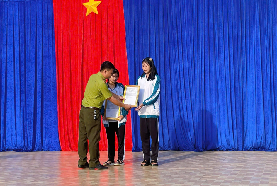 Ông Đinh Quốc Huy – Hạt trưởng Hạt Kiểm lâm khu vực Đạ Huoai trao tặng giấy khen và những phần quà ý nghĩa đến hai học sinh Trần Thị Bích Thủy và Đào Tân Hạ Quyên, học sinh lớp 10A5 trường THPT Đạ Huoai